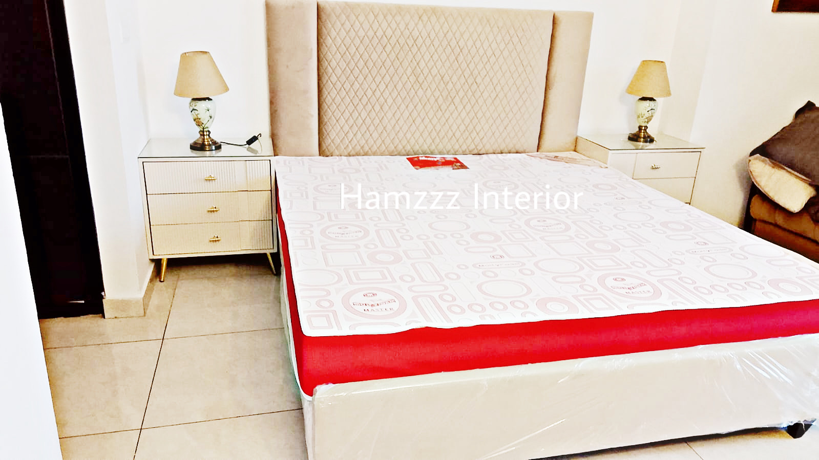 A stylish and durable bed paired with matching side tables for a clean, coordinated bedroom look.