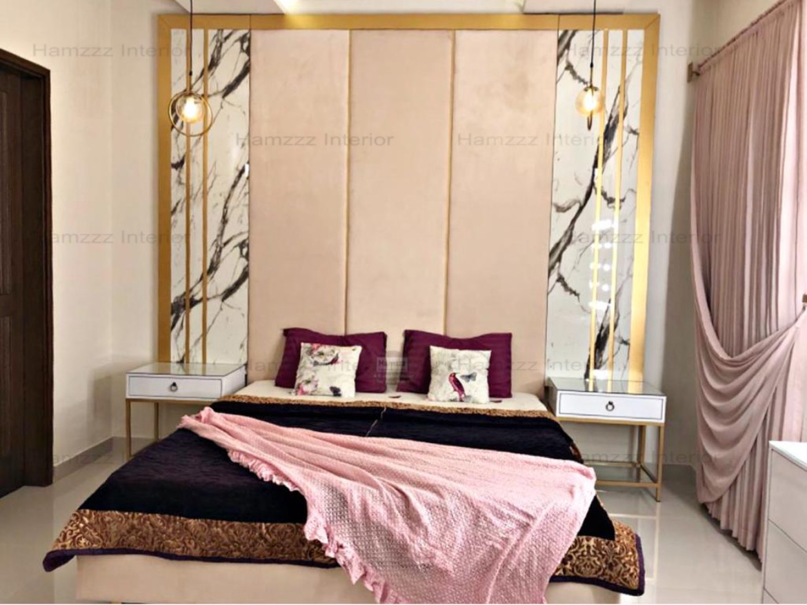 An architectural and immersive bedroom solution that combines a premium bed and side tables with a custom-designed feature wall paneling. The feature wall serves as an expansive, decorative backdrop that frames the bed, often incorporating integrated lighting, textured fabrics, or elegant wood detailing to add depth and height to the room. Complemented by matching side tables, this set transforms a standard sleeping area into a high-end, hotel-inspired suite with a powerful and unified visual impact.