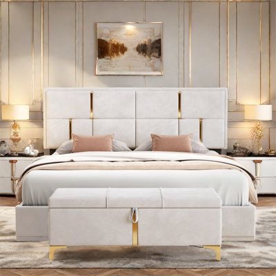 A complete and luxurious bedroom ensemble that combines a masterfully crafted bed, two matching side tables, and a stylish end-of-bed settee. This set is designed to maximize both comfort and functionality; the bed and side tables provide a symmetrical foundation for sleep, while the settee offers a sophisticated seating area for dressing, lounging, or reading. Together, these pieces create an expansive, high-end look that brings the refined atmosphere of a luxury suite into your home.
