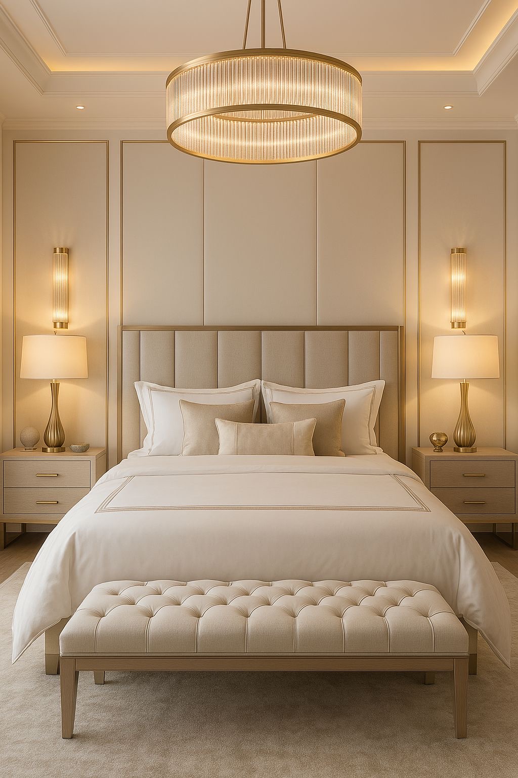 A complete and luxurious bedroom ensemble that combines a masterfully crafted bed, two matching side tables, and a stylish end-of-bed settee. This set is designed to maximize both comfort and functionality; the bed and side tables provide a symmetrical foundation for sleep, while the settee offers a sophisticated seating area for dressing, lounging, or reading. Together, these pieces create an expansive, high-end look that brings the refined atmosphere of a luxury suite into your home.