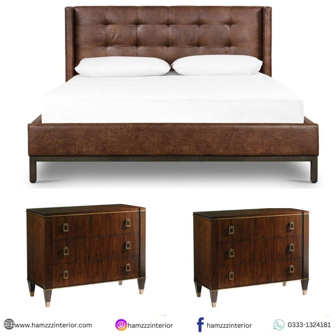 A premium bedroom pairing featuring an upholstered bed and matching side tables for a cohesive, luxury look. The bed offers a soft, meticulously tailored headboard for ultimate comfort, while the coordinated side tables provide convenient surface space and a unified aesthetic, creating a sophisticated and inviting retreat.